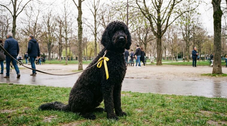 Puis, le regard s’accroche enfin à un détail jusqu’alors fondu dans le décor urbain. Cloué négligemment sur la laisse du chien placide approchant sur le trottoir, un curieux morceau de matière flotte au vent. Pas un grelot agaçant ni un bandana de parade post-toilettage, non. Il s’agit d’un banal ruban d’un jaune éclatant, fermement et volontairement noué à la boucle principale. Nombreux sont ceux qui passeraient leur chemin en pensant à un résidu de fil de chantier. Quelle tragique méprise ! Ce bout d’étoffe hurle pourtant à pleins poumons un signal capital pour la sécurité environnante.